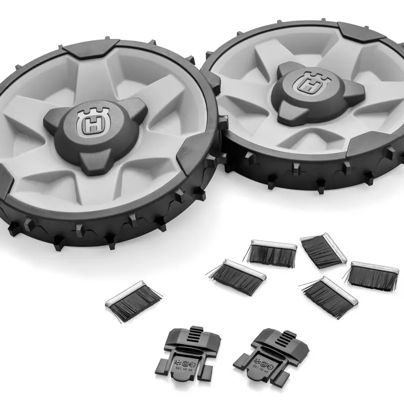 Sarja sisältää painavat takapyörät ja pyöräharjat, jotka varmistavat hyvän pidon rinteisellä nurmikolla.