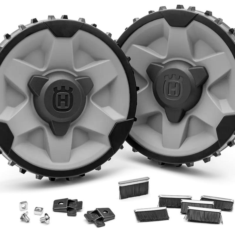 Sarja sisältää painavat takapyörät ja pyöräharjat, jotka varmistavat hyvän pidon rinteisellä nurmikolla.