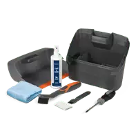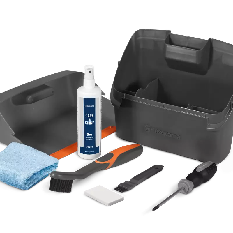 Tarvikkeet Automower-leikkurin puhdistamiseen ja hoitamiseen kauden aikana. Sisältää kaksi harjaa_ toinen kapea ja terävä ja toinen pieni, raaputtimella varustettu harja lian ja kuivuneen ruohon poistamiseen. Ruuvimeisseli leikkuuterien vaihtamista varten, hankausliina leikkurin ja latausaseman liittimien puhdistamiseen sekä pyyhe ja muoville tarkoitettu hoitosuihke, joilla muoviosat saa kiiltäviksi.