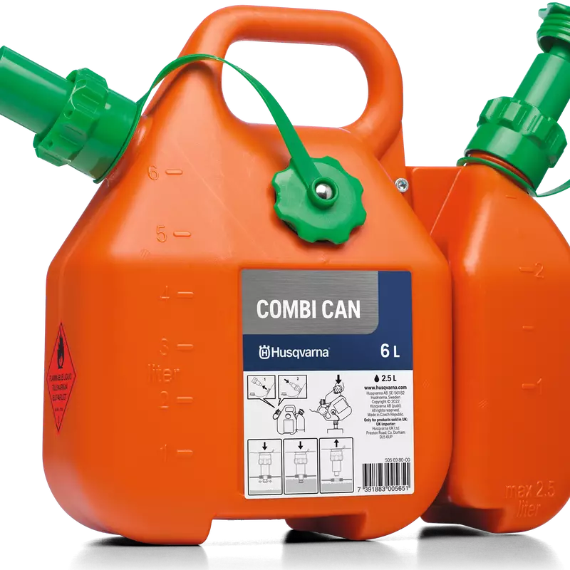 Kombikannussa on kätevä ylitäyttösuoja. Kun säiliö on täynnä, kannun nokassa oleva venttiili sulkeutuu automaattisesti ja voit nostaa kannua polttoaineen läikkymättä. Säiliöt voidaan erottaa toisistaan, ja niiden välissä on tilaa viiloille ja työkaluille.