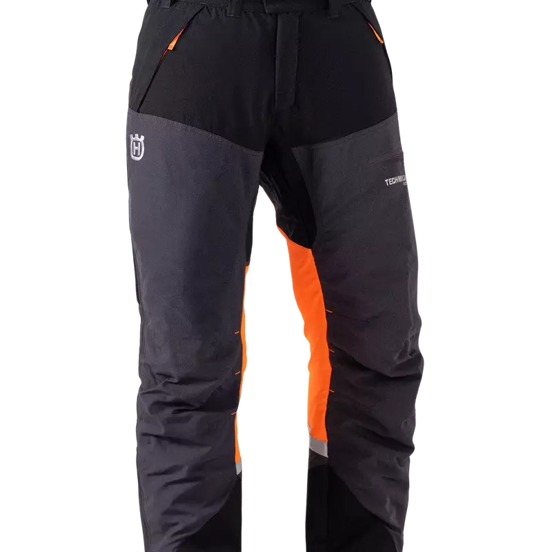 Husqvarna Technical Robust -turvahousut tarjoavat erinomaista mukavuutta ja kestävyyttä ykkösluokan sahasuojalla pitkiin metsätyöpäiviin vaativassa ympäristössä. Verkkokankaan ja monien vetoketjujen ansiosta housut ovat todella hengittävät. Housujen etuosa ja haarakiila on valmistettu erittäin kestävästä Dyneema®-kankaasta ja vyölenkit sekä lahkeen alaosa on vahvistettu vielä Cordura®-materiaalilla, joten housut ovat äärimmäisen kestävät. Punkkisuoja nilkkojen ympärillä ja neljään suuntaan joustava kangas takaosassa lisäävät käyttömukavuutta, jotta jaksaisit olla parhaassa terässä koko työpäivän ajan.